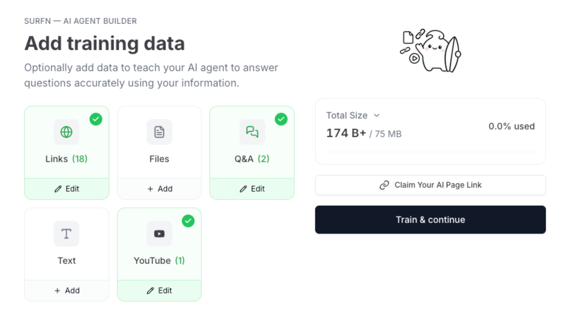 Sign up for a free Surfn account, go to your dashboard, and click + New AI Agent Page. Then start adding the content your assistant should answer from.