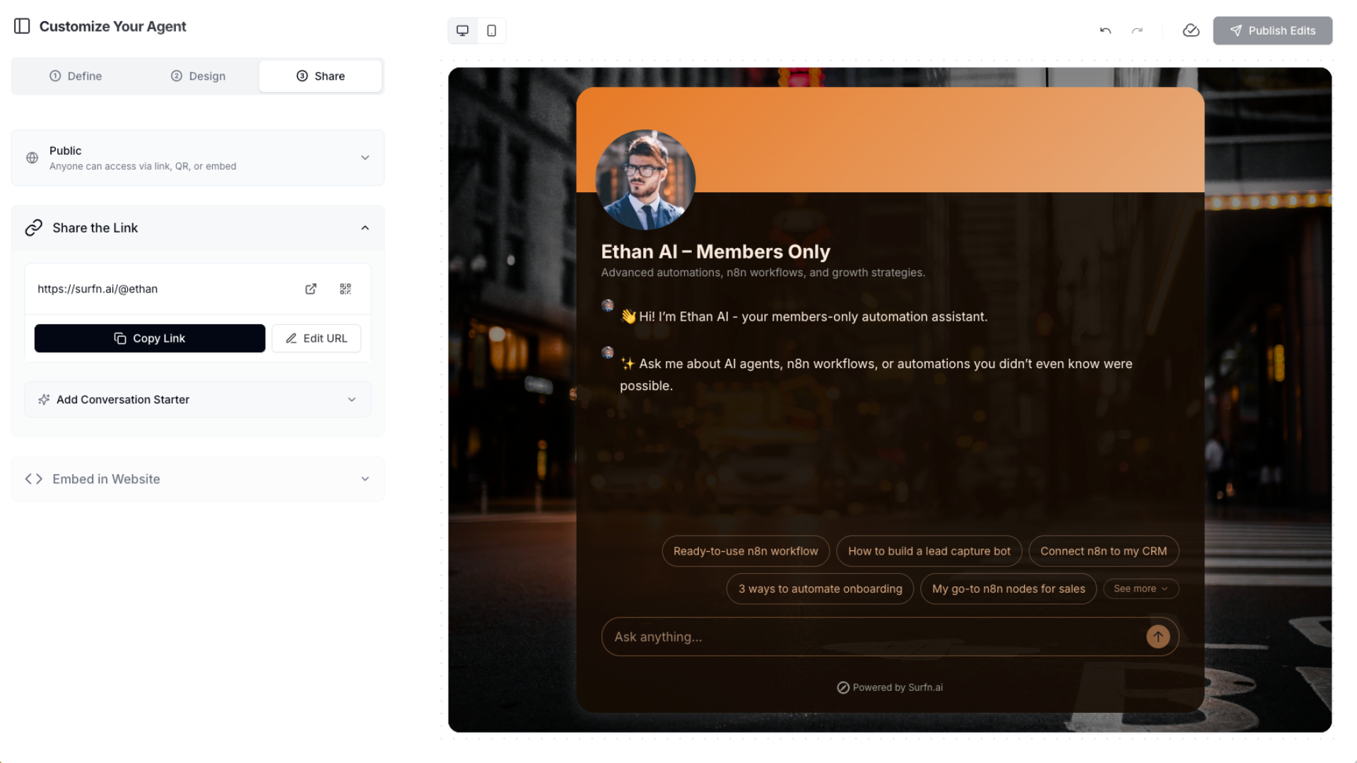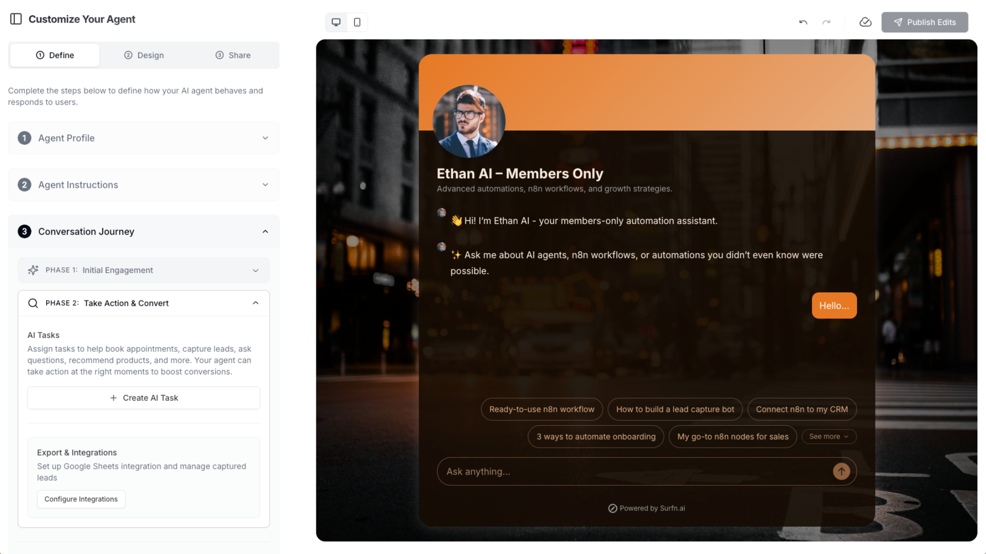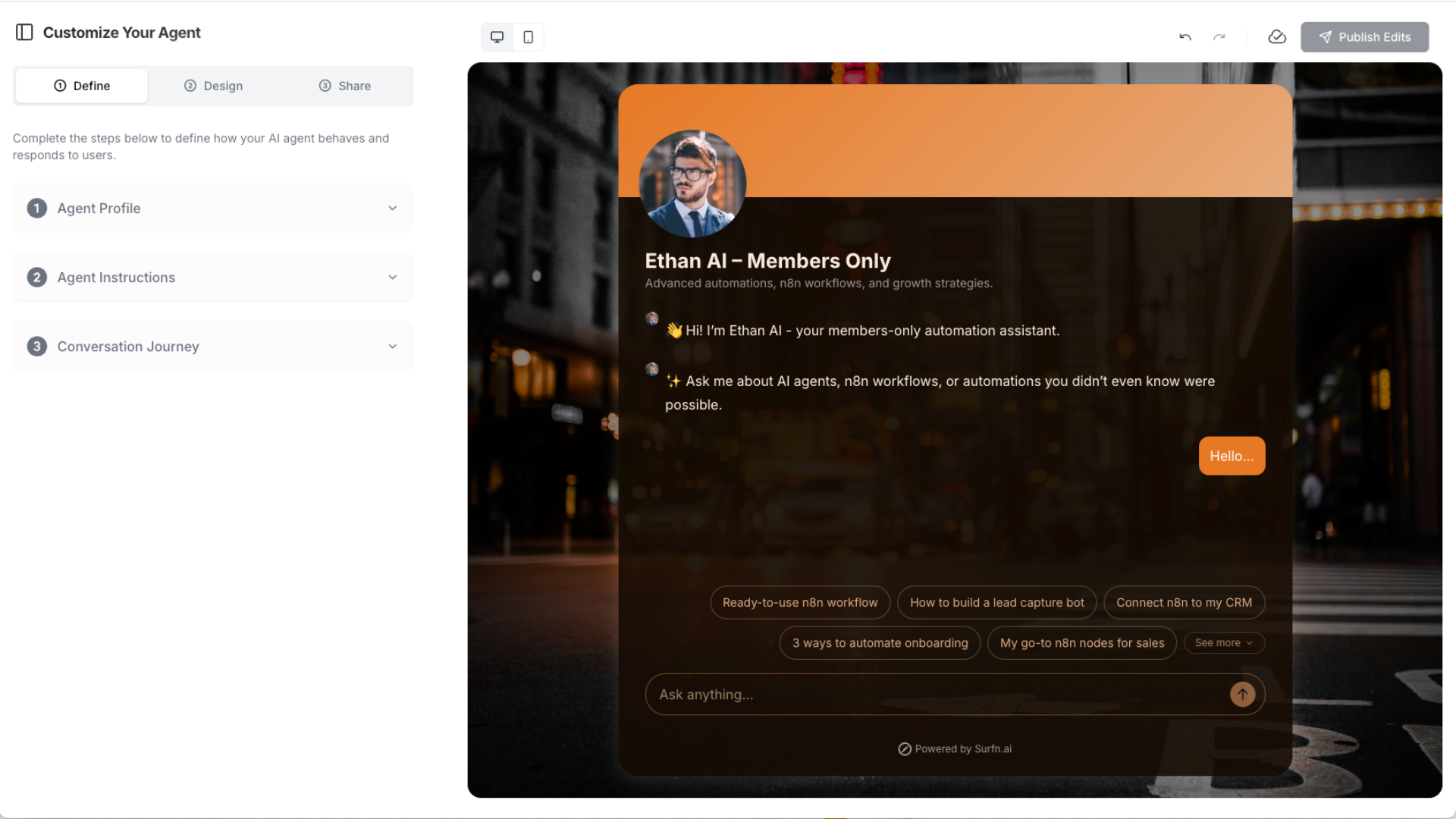 If you run a paid community, course, or membership, Surfn lets you create a members-only AI assistant trained on your content so members can get answers, guidance, and personalized help anytime. The setup is simple: create a new AI Agent Page, train it on specific content, define how the assistant should behave, customize the design, then share it with members inside your gated portal or through a link placed in your member-only area.